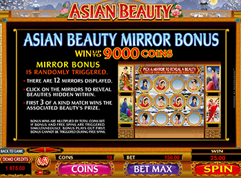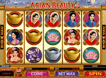 На экране симулятора Asian Beauty появляются изображения прекрасных жительниц азиатских стран. Также представлены картинки с сакурой, лотосом и чаш: серебряной и золотой. Два элемента наделены особыми возможностями. Вайлд – логотип аппарата, выполняет привычные функции. Он приносит выплаты за собственные комбинации и замещает другие картинки. Рассыпная пиктограмма приносит выигрыши, независимо от занимаемой ячейки. Символ также активирует раунд свободных вращений с дополнительным мультипликатором, удваивающим выплаты.