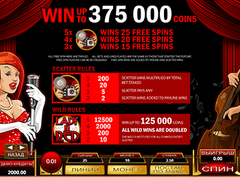 Великолепный вечер в дорогом ресторане подымет вам настроение. Играет пианист, поет красотка, а финансовое состояние кошелька улучшается. Прибыльный игровой автомат Lady In Red входит в топ лучших моделей с интересным сюжетом.